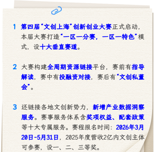 赛前,各区赛道将针对性开展分赛道报名指导、配套政策深度解读及产业环境实地宣介,帮助企业精准把握落地契机,同时合作“数龙杯”全球AI创新大赛等赛事,并计划在北京、浙江、江苏、成都、广州、深圳等全国文创高地同步开展跨地域赛事联动,实现跨区域资源互通与赛事宣介;赛中,依托“文创上海”创投汇,联动投资机构、文化产业基金及银行等金融机构,通过项目路演、资本问诊的形式,为各赛道参赛项目提供专场一对一的投融资深度对接;赛后,开展“文创私董会”,围绕获奖企业核心发展需求,汇聚上下游企业及潜在合作方,深度链接市场资源,为项目打造从精准落地、资本助力到产业深化的完整服务闭环。获奖企业还将享受政策申报、人才补贴、落地孵化、成果展示等十大专属服务,获得全维度发展赋能。