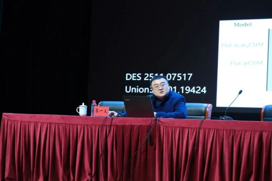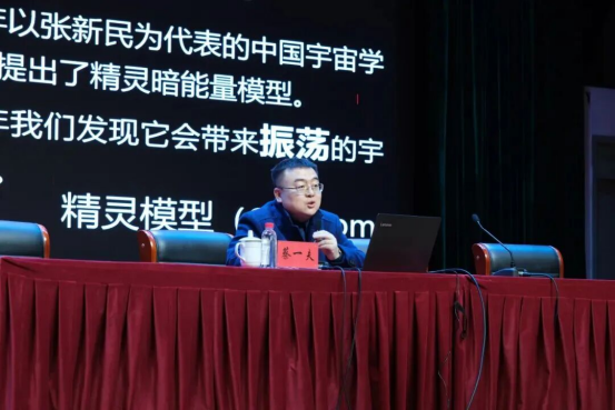 在“宇宙加速膨胀之谜”的探讨中,蔡教授介绍了当前三大主流猜想,并着重分享了我国科学家在暗能量模型研究中的前沿成果:从精质场到幽灵场、精灵场理论,中国学者正以创新思维破解宇宙学难题。他还展示了暗能量光谱仪的观测数据——高精度宇宙3D照片为暗能量性质研究提供了关键证据,并抛出“暗能量是否随时间变化”的开放命题,引发在场师生的深度思考。