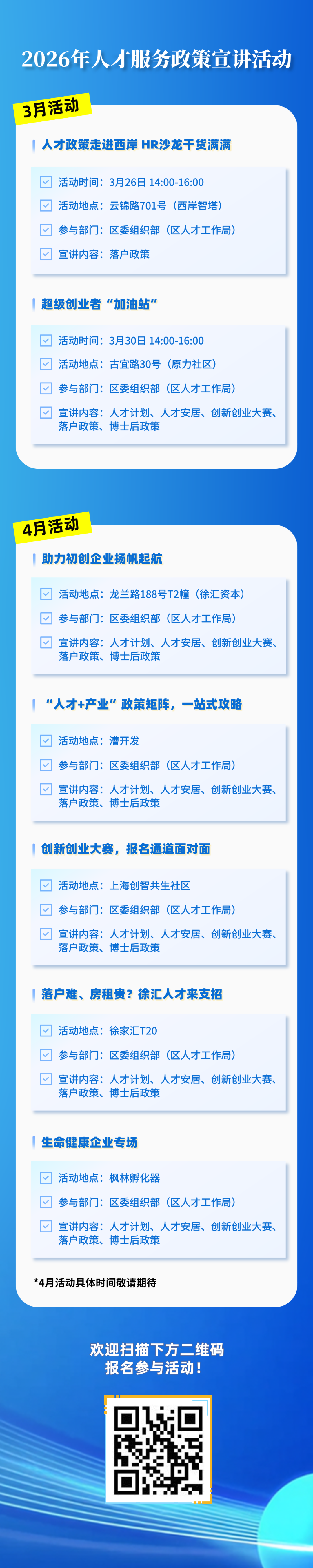此场活动是徐汇区打造优质人才生态,开展“人才四季”交互系列活动“春启纳才·政策直通车”的首站亮相,后续还推出系列活动,诚邀海内外英才报名参与,具体如下。