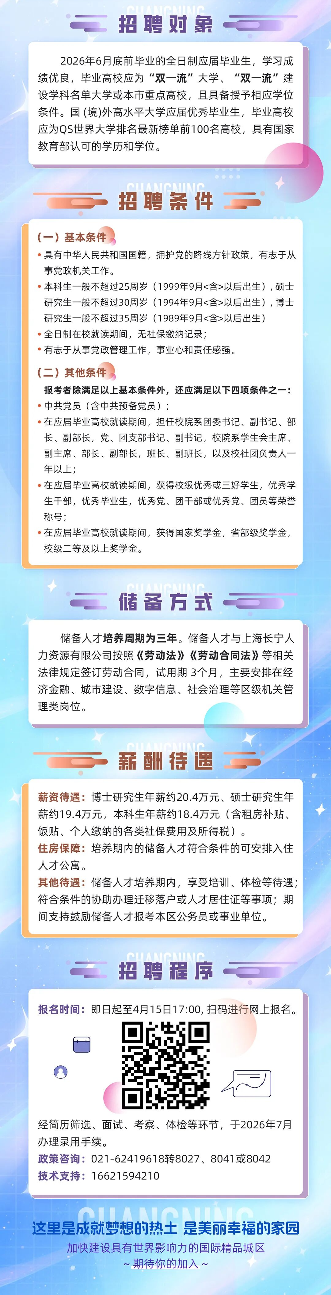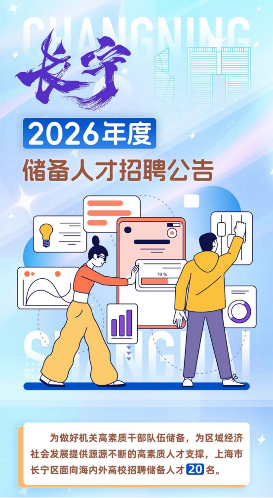 长宁区新闻办介绍,即日起至4月15日,长宁区开启2026年度储备人才招聘网上报名!本次计划招聘20名储备人才。